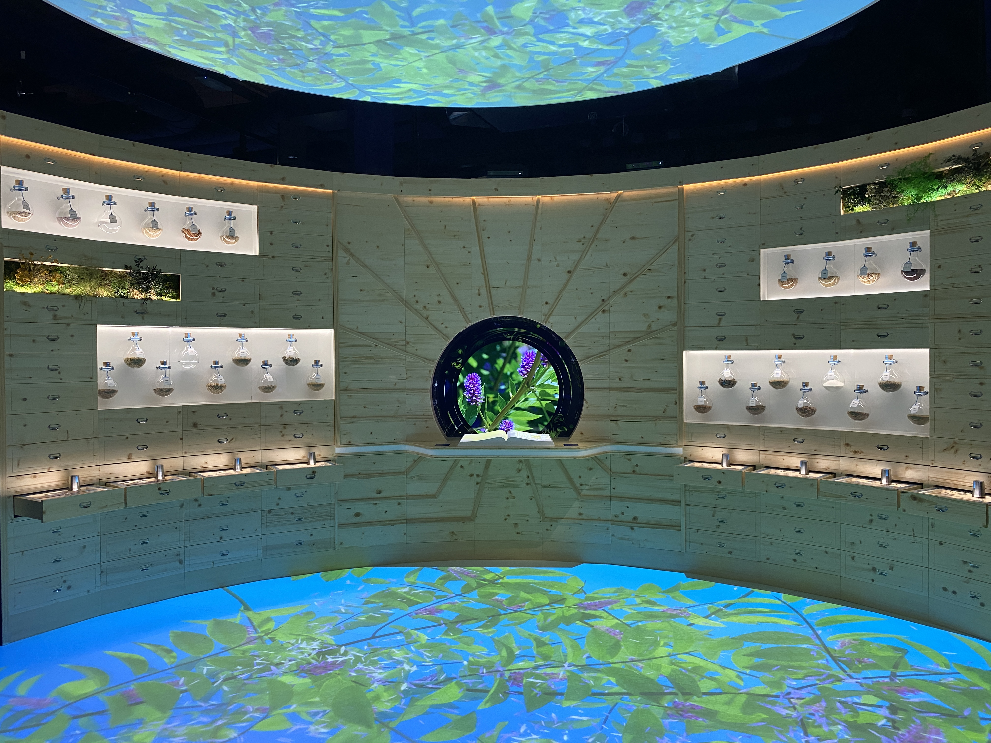 At the heart of the central area, I found a circular space that beautifully combined the authentic with the modern. Here, the nature of aniseed was unveiled in a captivating display. Over 40 natural ingredients were meticulously showcased in bottles and olfactory drawers. The setup was designed to enhance the sense of immersion with video projections and sound design that transported me into this natural world. It was fascinating to see how aniseed, a simple plant, could be transformed into such a complex and beloved spirit.